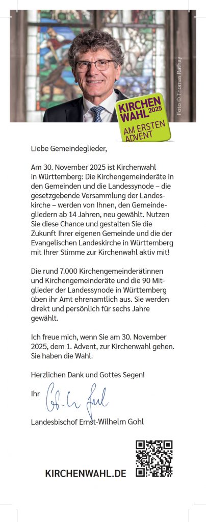 Am 30. November 2025 sind Kirchenwahlen in der württembergischen Landeskirche. Über 1,5 Millionen evangelische Kirchenmitglieder sind aufgerufen, ihre Stimme für neue Kirchengemeinderäte und für eine neue Landessynode abzugeben. Wahlberechtigt sind alle Gemeindemitglieder, die am Wahltag das 14. Lebensjahr vollendet haben.